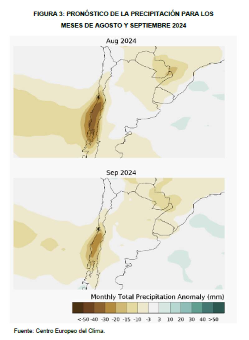 Sin embargo, para las próximas semanas, Santibáñez asegura que el “el anticiclón se prevé que adopte una posición de bloqueo, que impediría el paso de nuevos frentes a la zona central de septiembre en adelante. También se ve que las precipitaciones a partir de agosto estén por debajo de lo normal, sobre todo en la costa, pese a que algunos frentes podrían dejar algunas precipitaciones las próximas semanas”.