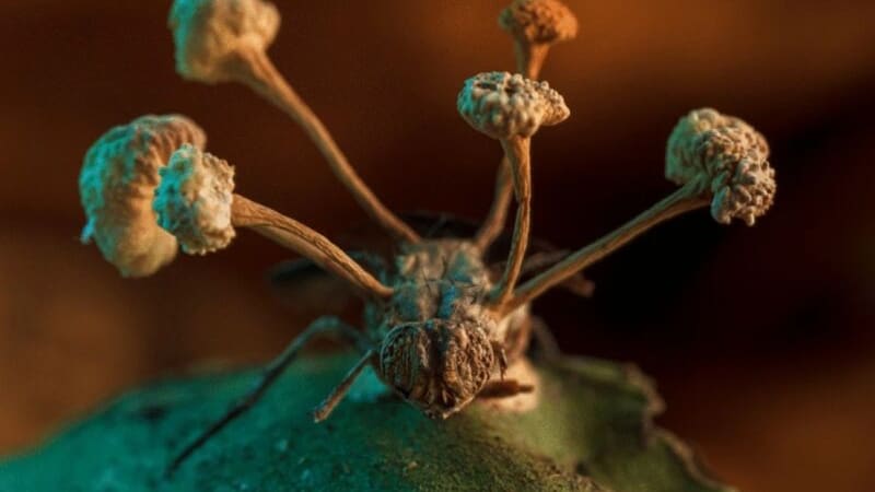 Estos hongos infectan a los insectos infiltrándose en su exoesqueleto y mentes y se ven obligados a migrar a un lugar más favorable para el crecimiento del hongo. Así, esperan la muerte, momento en el cual el hongo se alimenta de su anfitrión. La imagen es la ganadora de un concurso fotográfico.