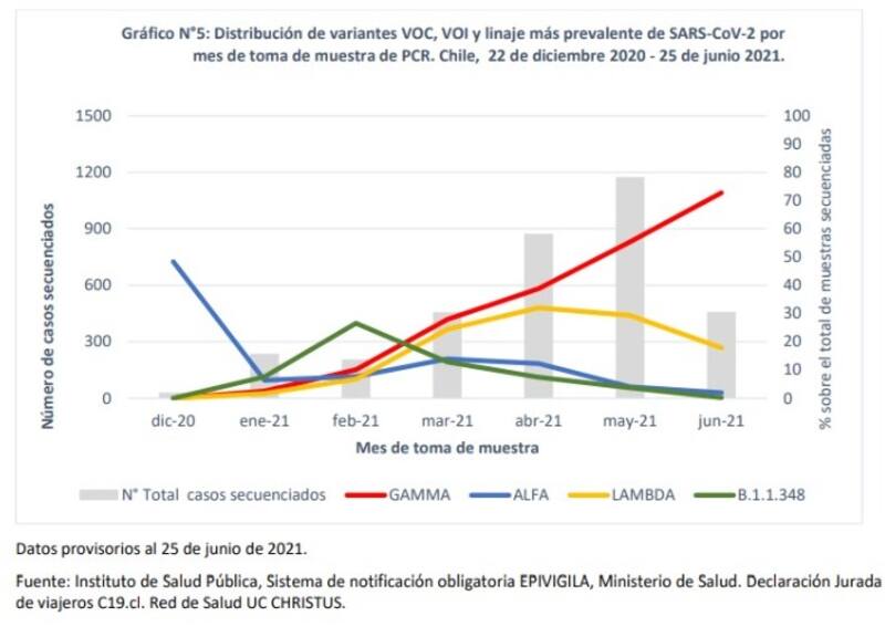 En cuanto a las VOC, la principal es Gamma (1.479 muestras), lo que representa un 84,2% del total de las variantes de preocupación y casi la mitad de las muestras secuenciadas (43%). Respecto a las VOI o varaintes de interés, la que más se ha detectado es Lambda, que representa un 91,9% (837 muestras) del total y el 24,3% de todas las secuenciaciones realizadas desde el 25 de diciembre al 25 de junio.
