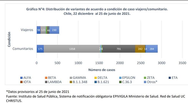 La variante Alfa (británica) fue identificada en 9 muestras, distribuidas en las regiones de Antofagasta, Atacama, Valparaíso, Metropolitana, del Libertador Bernardo O’Higgins y Biobío. La variante Delta, fue identificada en una muestra correspondiente a una persona de la Región del Maule el 24 de junio.