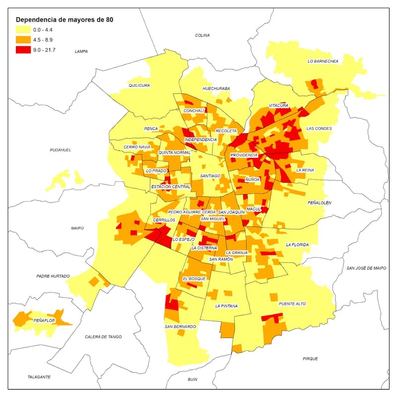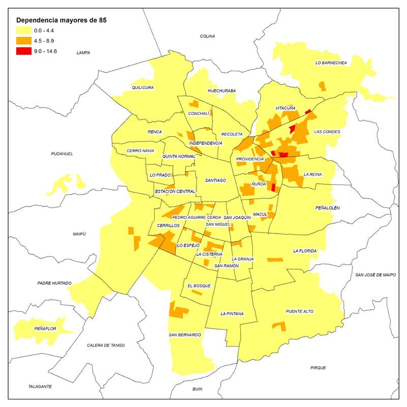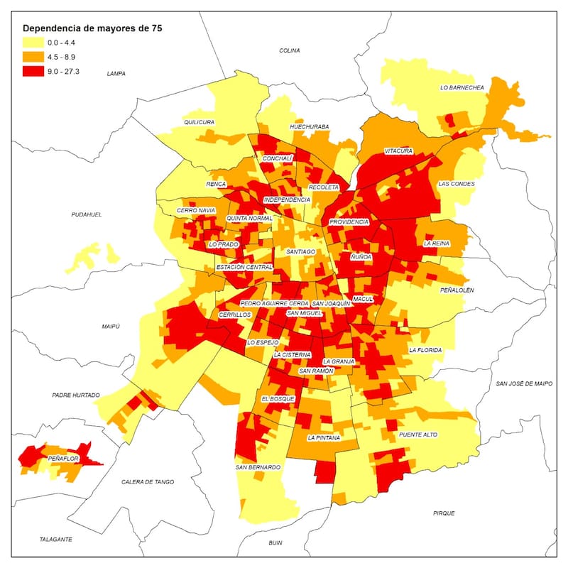 Así, por ejemplo, en el caso de los mayores de 75 y su distribución en la RM, la imagen muestra la menor a mayor concentración, según la tasa de dependencia, que da cuenta de mayor zonas rojas, el tramo más alto de concentración en comunas como Las Condes y Vitacura (ver mapa).