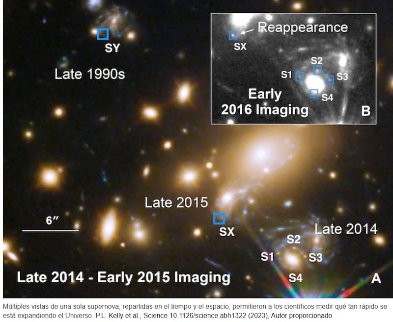 Así que nuestras imágenes con lentes muestran la misma supernova, que explotó en un cierto punto en el tiempo, pero cada imagen ha recorrido un camino diferente. Al observar la llegada a la Tierra de cada aparición de la supernova, una de las cuales ocurrió en 2015, después de que la estrella en explosión ya había sido vista, pudimos medir su tiempo de viaje y, por lo tanto, cuánto había crecido el Universo mientras la imagen estaba en tránsito.