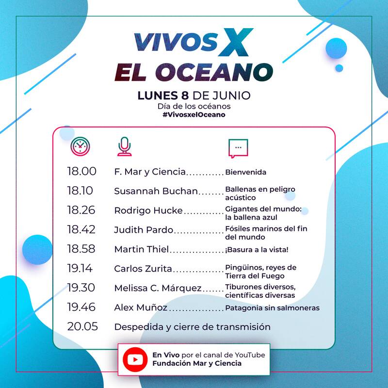 El evento es convocado por Fundación Mar y Ciencia y cuenta con la participación de Algalab, Copas Sur-Austral, Fundación Oceanósfera, Chile es Mar, Océanos Prehistóricos y Núcleo Pintarroja. “Estamos muy entusiasmados y hemos trabajado en colaboración para entregar un evento de calidad, ameno e interesante, y que además ofrezca un momento de distracción en estos tiempos difíciles. Personas de todo el mundo podrán acceder a la transmisión en vivo que cuenta con la participación de reconocidos investigadores de clase mundial”, explica Felipe Pizarro, biólogo marino y director ejecutivo de Mar y Ciencia.