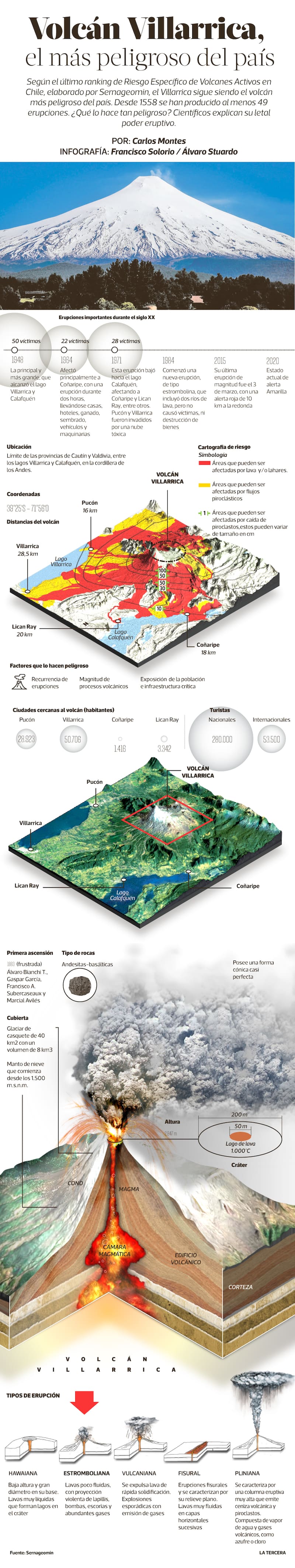 “Eventualmente los peligros son siempre los mismos. Al momento de ocurrir una erupción, en el caso del Villarrica, los lahares son lo más importante”, afirmó en una nota a Qué Pasa el director del Instituto Milenio de Investigación en Riesgo Volcánico Ckelar Volcanes, Felipe Aguilera. Los lahares suelen tener un mayor impacto en estas fechas, donde hay más nieve, y las probabilidades de que ocurran son más altas.