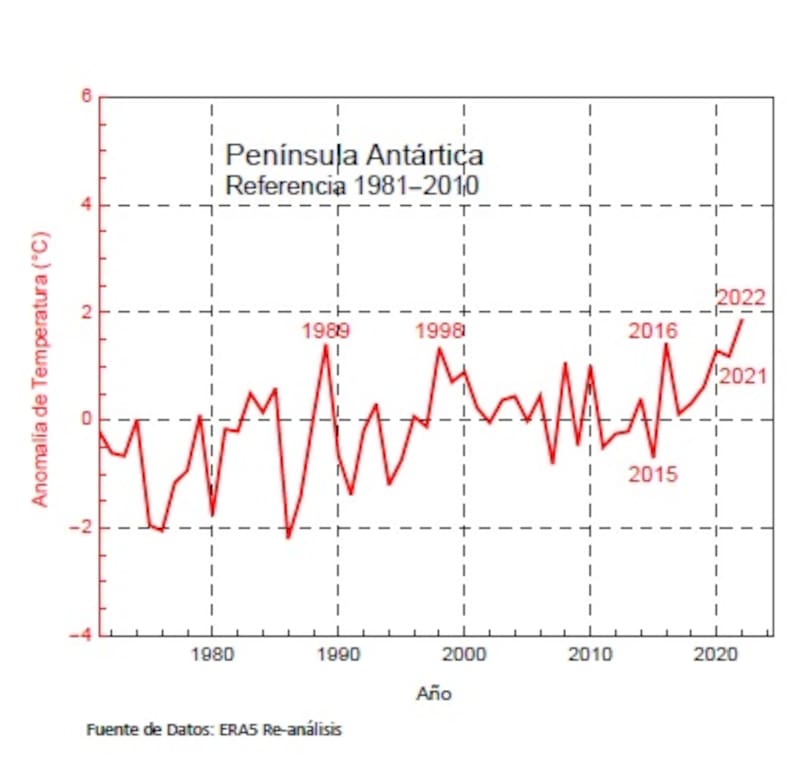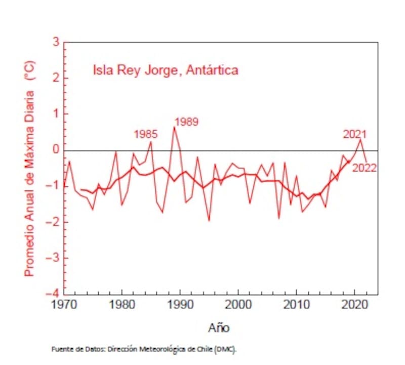 En términos de temperatura máxima diaria, 2022 quedó entre los cinco años más cálidos registrados en las últimas tres décadas en la Isla Rey Jorge. Desafortunadamente, las perspectivas no son buenas. “Es una de las zonas del mundo que mas se ha calentado en las ultimas décadas y es probable que este rápido calentamiento continúe. El récord de calor establecido en 2022 no durará mucho”, estima el climatólogo.