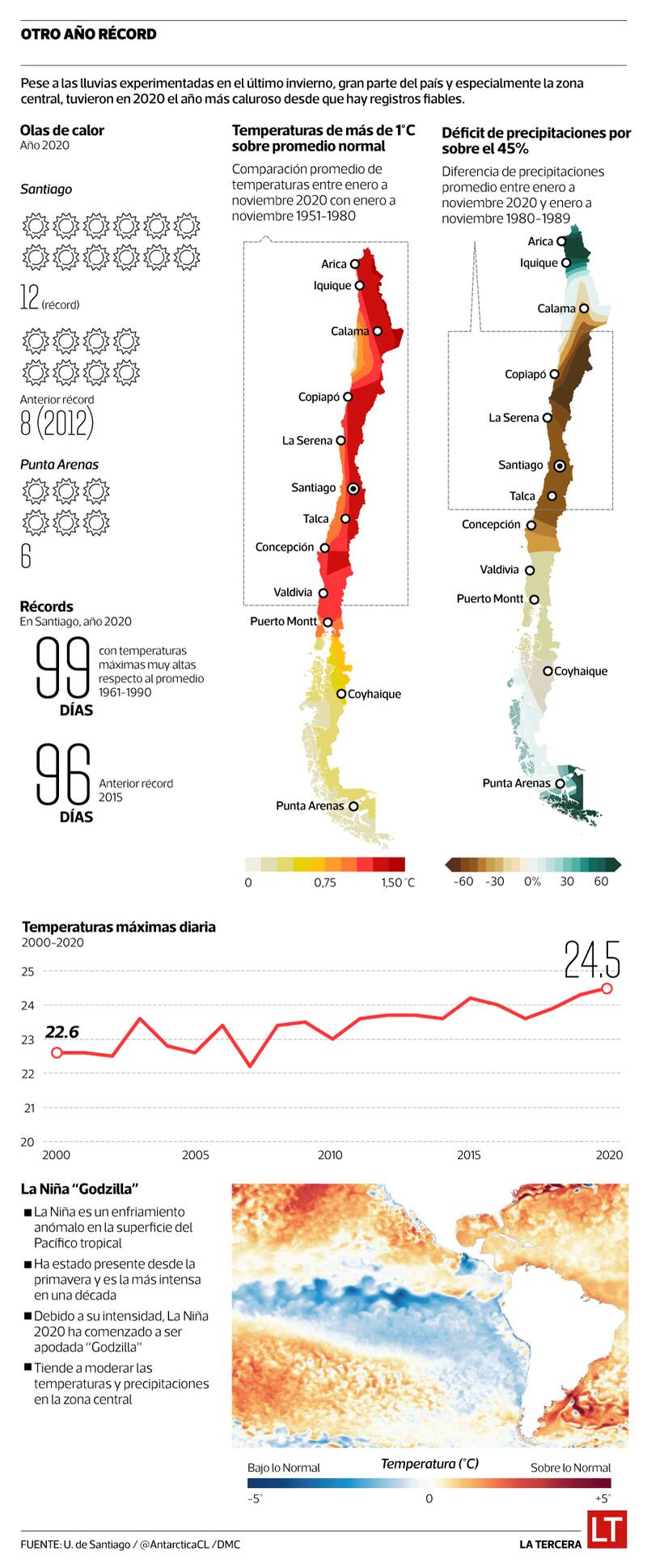 Durante 2020, solo Santiago registró un récord de 12 olas de calor. Esta marca superó ampliamente la cifra de ocho olas registradas en 2012, y es seis veces superior a las dos olas de calor que anualmente se registraban en Santiago hace tres décadas. Son algunos de los datos que arrojó el informe climático “2020 otro año récord”, realizado por la Universidad de Santiago, y liderado por Raúl Cordero.