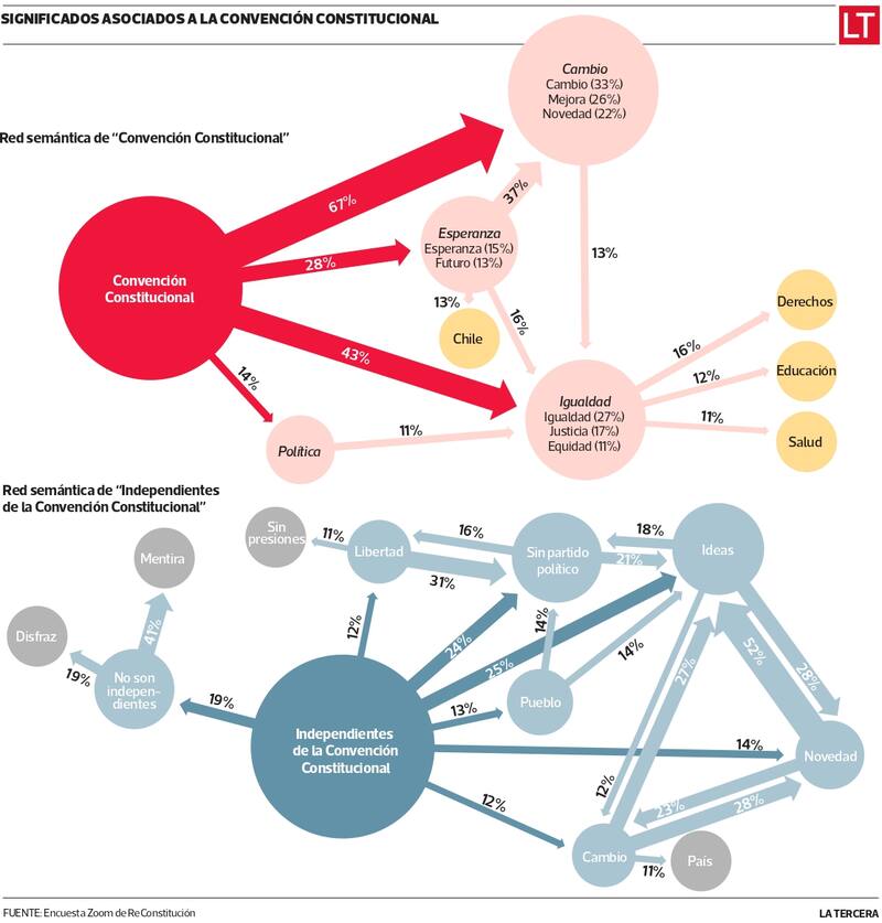 En la infografía, por ejemplo, se ve que un 67% al ser preguntado por el concepto “Convención” respondió con la palabra “Cambio”, y un 28%, con “Esperanza”. Luego, siguiendo el orden y sentido de las flechas, un 37% de quienes dijeron la palabra “Esperanza” respondieron con el concepto “Cambio”. Al seguir esa misma lógica, se va armando la red semántica.