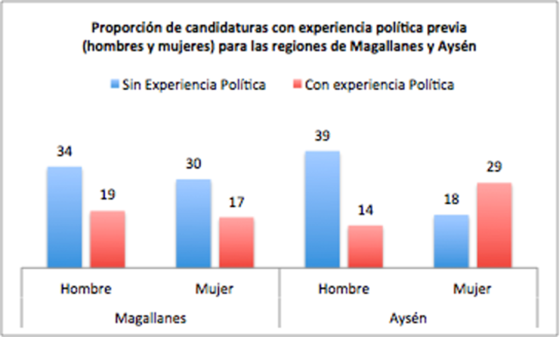 Respecto de las candidaturas por región, las regiones que han incorporado a sus listas de candidaturas una mayor proporción de mujeres con experiencia política son Aysén con un 29% (sobre un total de 28 candidaturas) y Magallanes con un 17% (sobre un total de 47 candidaturas). Es interesante porque en estas dos regiones están destacando en primer lugar que #SiHayMujeres, que tienen trayectoria política previa, las cuales ven posibilitada su visibilización, algo que es tradicionalmente el gran problema de las mujeres en política, el que se les de su lugar.