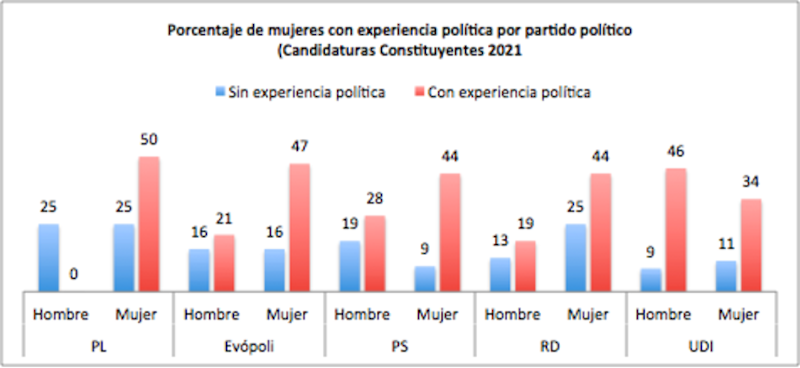 Respecto de las candidaturas por partido político, aquellos (tanto de izquierda como de derecha) que incluyen en sus candidaturas una mayor proporción de mujeres con experiencia política son, en orden descendente: el PL con un 50% de mujeres con experiencia política (de un total de 4 candidaturas); Evópoli con un 47% (sobre un total de 19 candidaturas), RD y PS con un 44% (sobre un total de 16 y 32 candidaturas respectivamente) y la UDI con un 34% (sobre un total de 35 candidaturas). Se podría decir que estos son los partidos que han ponderado en mayor medida potenciar las candidaturas de mujeres con experiencia política previa.