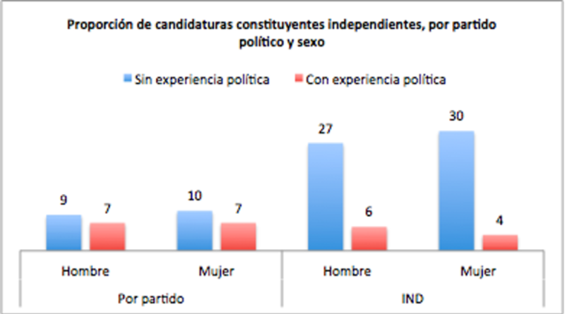 Del total de candidatas, las mujeres con experiencia política representan el 11% del total, mientras que los hombres representan el 13% (tanto de las candidaturas independientes como por partido político.
