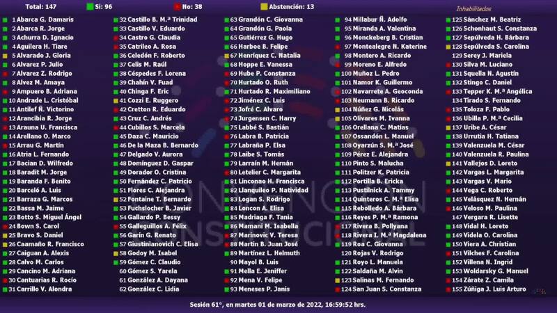 La iniciativa, que de acuerdo al vicepresidente de la Convención, Gaspar Domínguez, fue presentada por un grupo de convencionales constituyentes de distintos sectores, fue aprobada cerca de las 17.00 horas con 96 votos a favor, 38 en contra y 13 abstenciones.