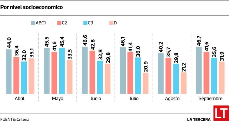 Sobre el factor socioeconómico, todos los sectores (ABC1, C2, C3 y D) tuvieron un alza en el involucramiento con el proceso constituyente, sin embargo, ABC1 continúa liderando con los números más altos desde el inicio del estudio e, incluso, esta nueva entrega arrojó que alcanzó su mayor alza con un 46,7%.