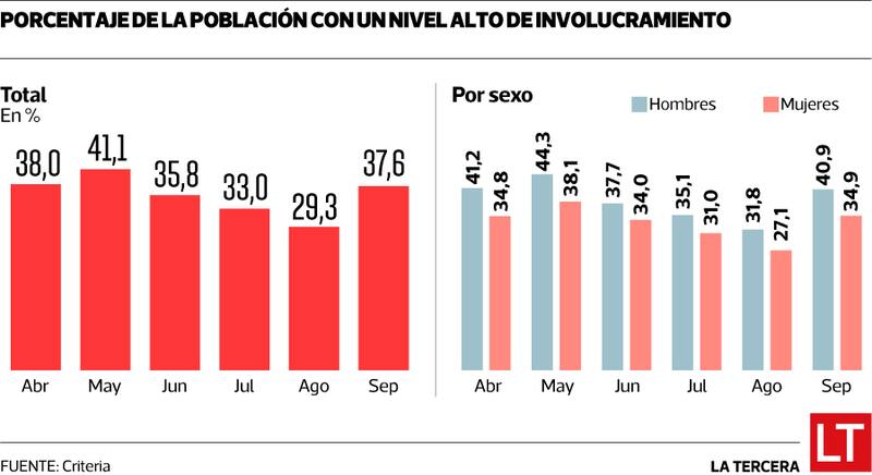 El estudio identificó a la población según su género, edad, nivel socioeconómico y preferencia política. Desde la primera hasta la última entrega, las mujeres son quienes destacaron como el género menos involucrado con el proceso constituyente, no obstante, en el nuevo informe la cifra aumentó de un 27,1% (agosto) a un 34,9%. Por su parte, los hombres también tuvieron un alza de 8,3 puntos porcentuales, llegando a un 40,9% de su población que sostiene un nivel alto de involucramiento.