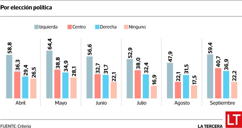 El pensamiento político predominante entre los encuestados fue la izquierda con un 59,4% y, por su parte, la derecha representa el 36,9%. Quienes se sienten identificados por el centro tuvieron un ascenso considerable desde el último reporte: de un 22,1% a un 40,7%.