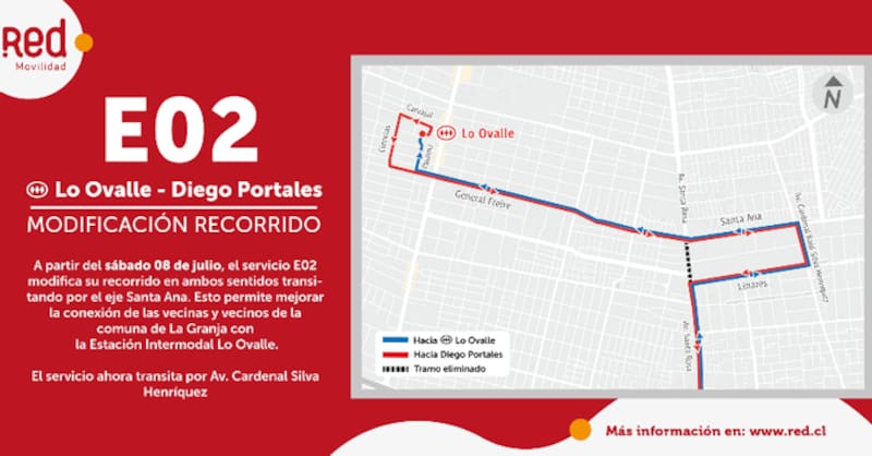 La Red Metropolitana de Movilidad, anunció que a partir del sábado 8 de julio, se realizarán una serie de modificaciones en 10 servicios de buses de la Región Metropolitana. Dentro de ellas se encuentra el recorrido E02, el cual modificará su trazado en ambos sentidos.