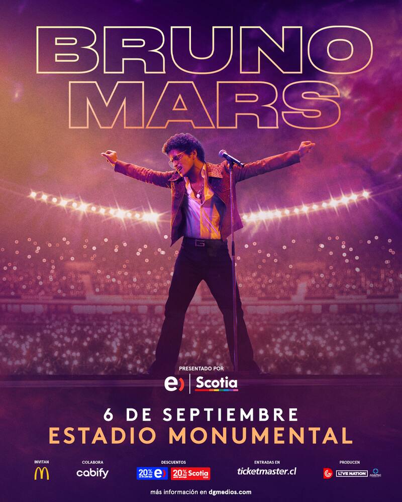 Se confirma que el cantante estadounidense Bruno Mars se presentará por tercera vez en Chile en el Estadio Monumental de Santiago.