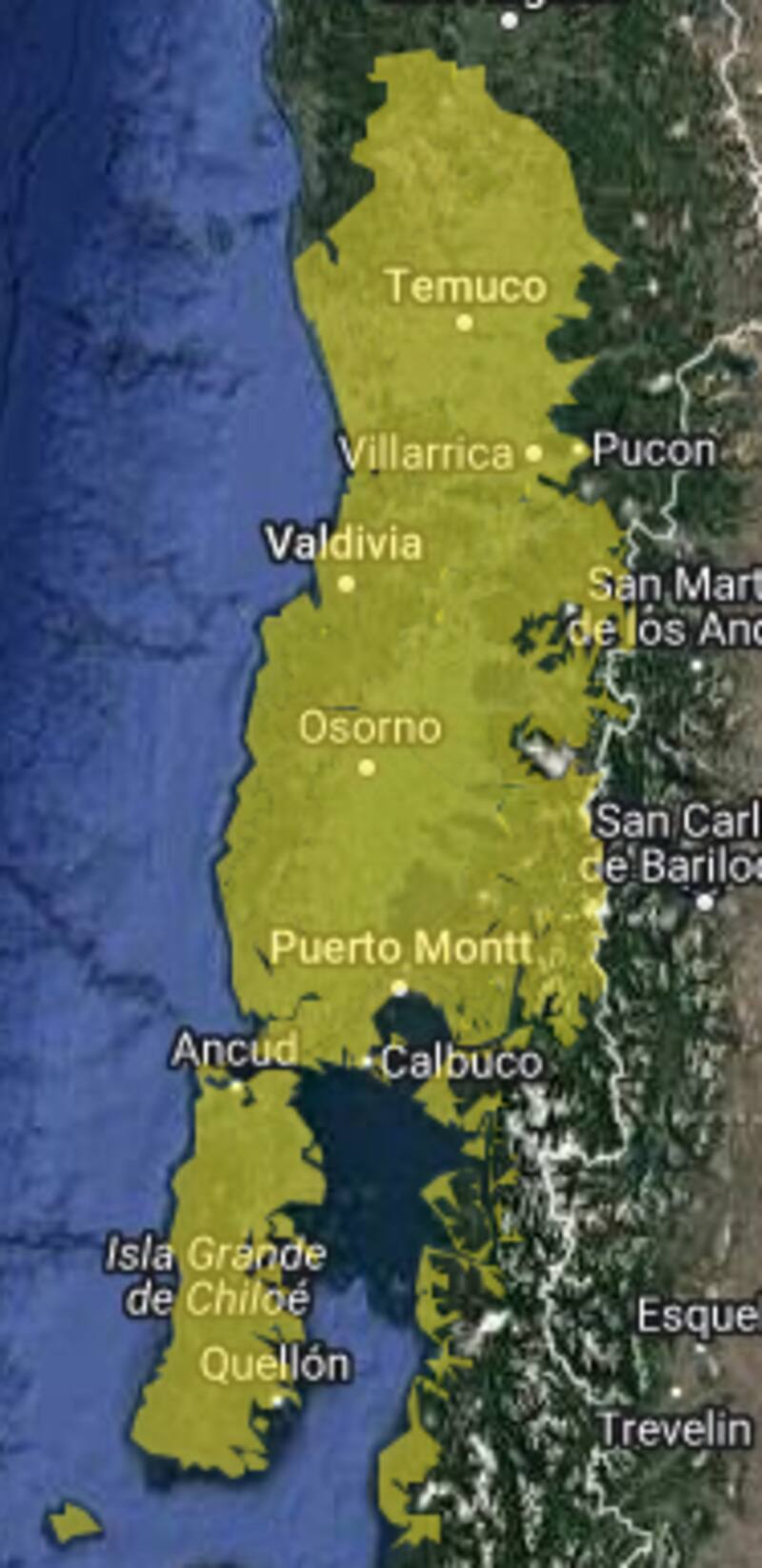- Región de Los Ríos: litoral Cordillera de la Costa, valle y precordillera.