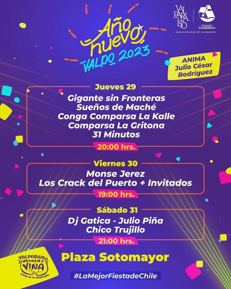 El Año Nuevo 2023 en Valparaíso, se realizará los días jueves 29, viernes 30 y sábado 31 de diciembre, de manera gratuita y con aportes solidarios para los damnificados de la ciudad de Viña del Mar. Los invitados a presentar su show en el escenario son: