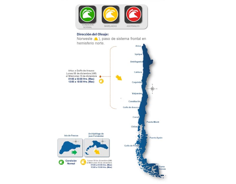 El Centro Meteorológico de Valparaíso, dependiente de la Armada de Chile, realizó a la comunidad un aviso de marejadas anormales entre las costas de Arica, en el norte del país, hasta el golfo de Arauco, en la Región del Biobío.