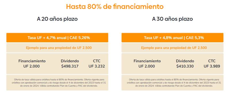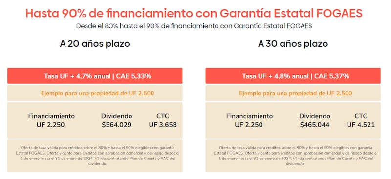 El financiamiento es por hasta el 80% del valor de la propiedad, y desde 80% hasta 90% con Fogaes. Para acceder a estas tasas, el cliente debe tener o adquirir plan de cuenta y PAC del dividendo.
