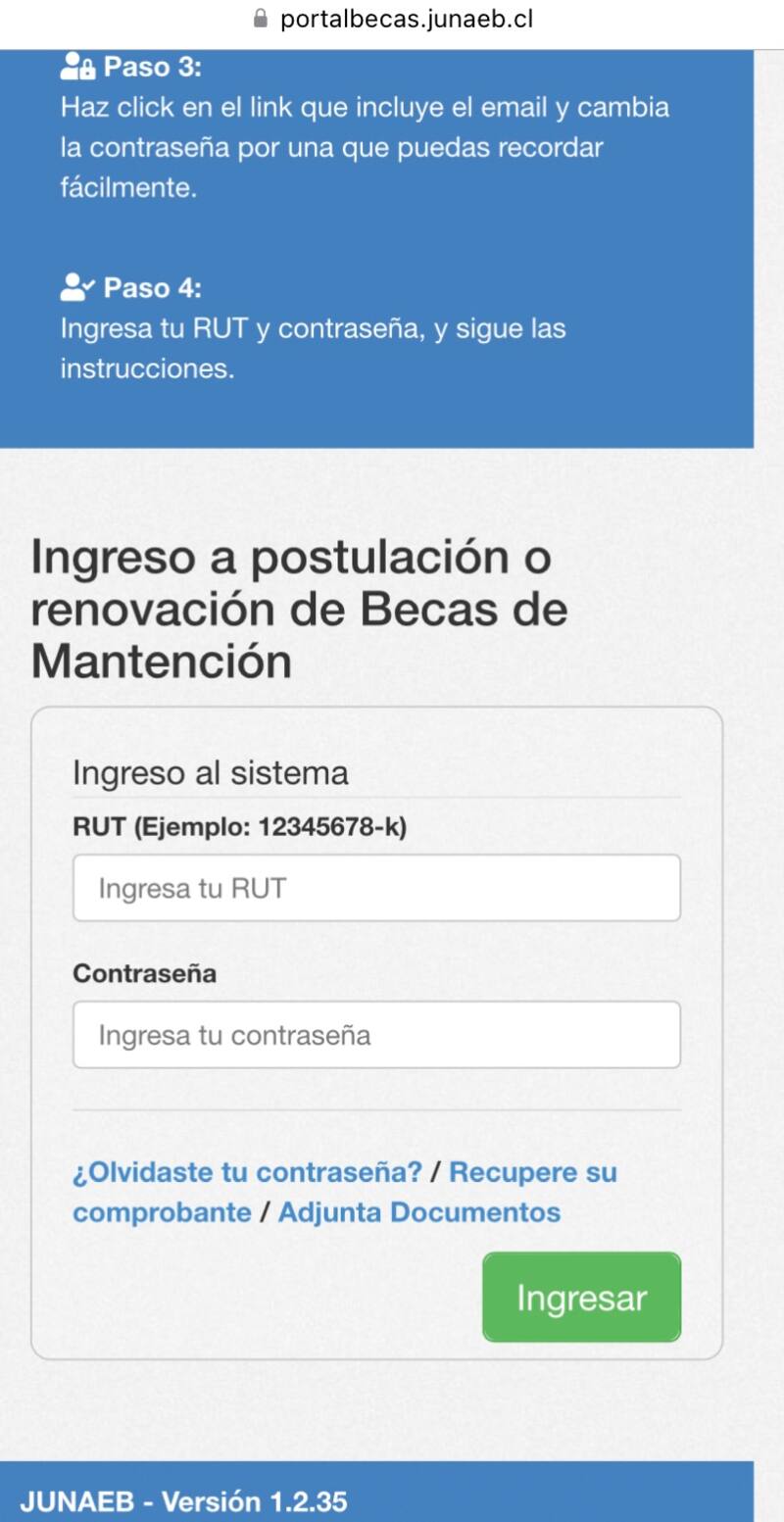 - Una vez que ya se creó la cuenta, la persona deberá ingresar su RUT y contraseña en la página de la Junaeb.