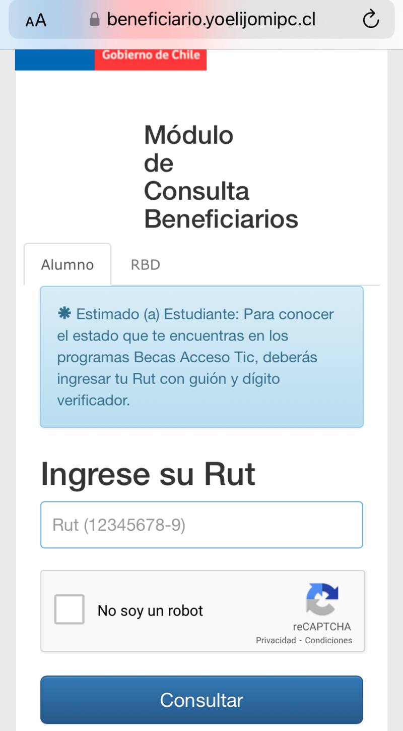 - Revisar en la siguiente página de la Junaeb en la que solicitará el RUT del estudiante.