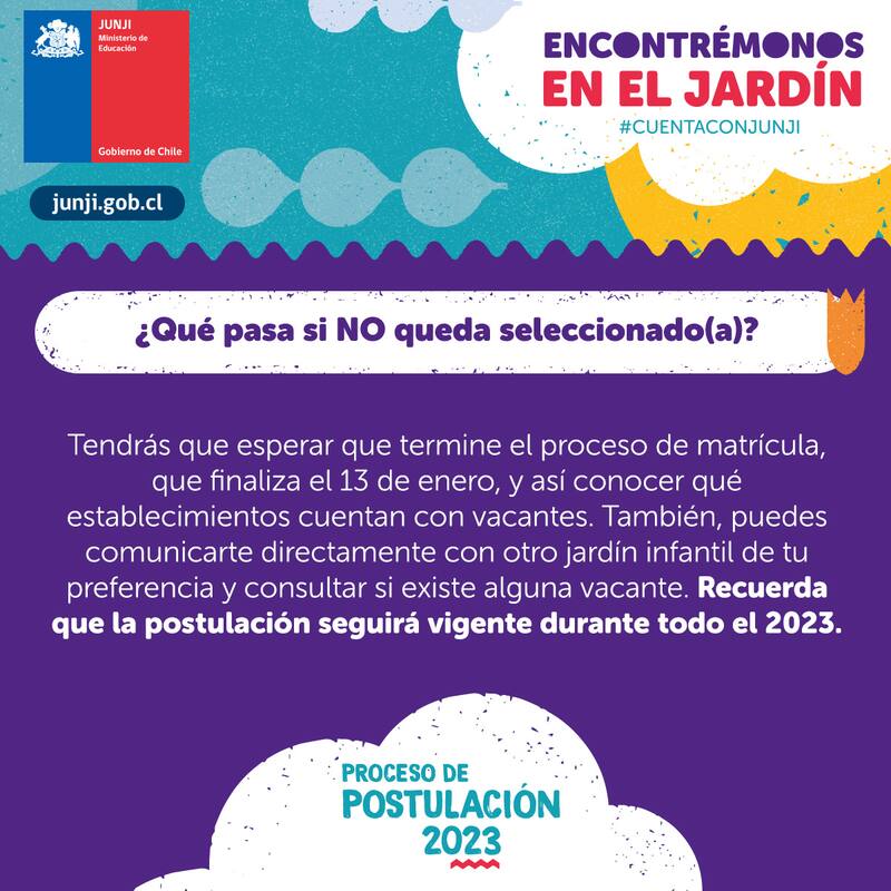 De haber sido seleccionado, el sitio de la Junji informa que desde el establecimiento se comunicarán con la familia en un plazo máximo de 10 días hábiles, para continuar con la matrícula.