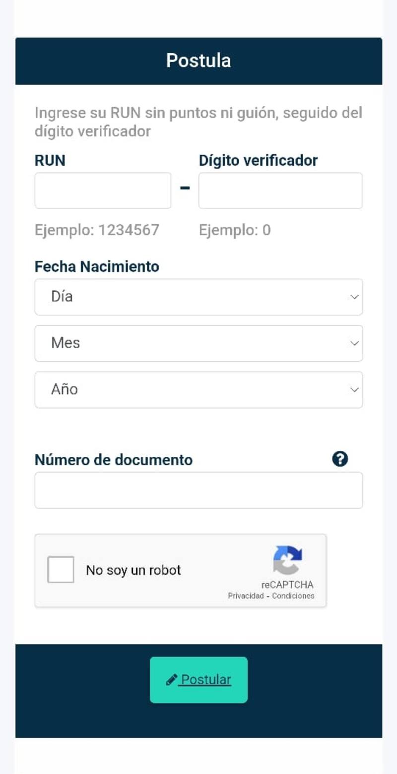 - Escribir el RUN, fecha de nacimiento, número de documento y validar el captcha. También se puede ingresar con Clave Única.
