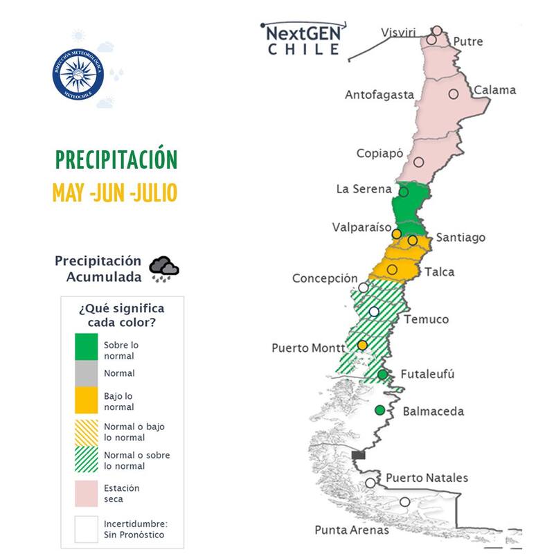 Se estiman precipitaciones para distintas zonas de Chile en el trimestre mayo, junio y julio.