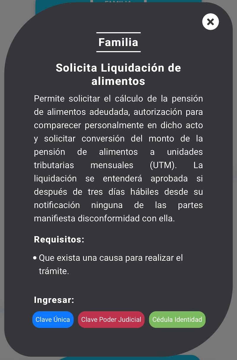 Un trámite que permite solicitar el cálculo de la pensión de alimentos adeudada, a través de la página web del Poder Judicial, de igual manera recibir una autorización para comparecer personalmente y solicitar conversión del monto de la pensión de alimentos a Unidades Tributarias Mensuales (UTM).