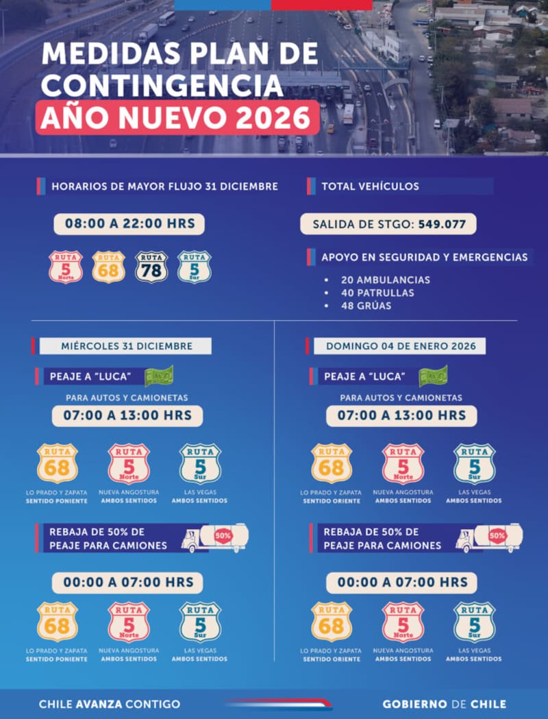 La medida es parte del plan de contingencia presentado desde el Ministerio de Obras Públicas (MOP), en el marco de los trayectos a realizar con motivo del festejo del Año Nuevo 2026 y también el inicio de las vacaciones estivales.