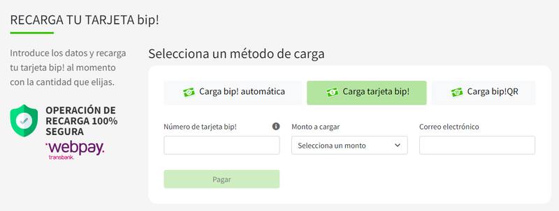 Para cargar la Tarjeta Bip!, a través de Internet, se puede realizar por distintos sitios webs habilitados. Algunos de ellos son: