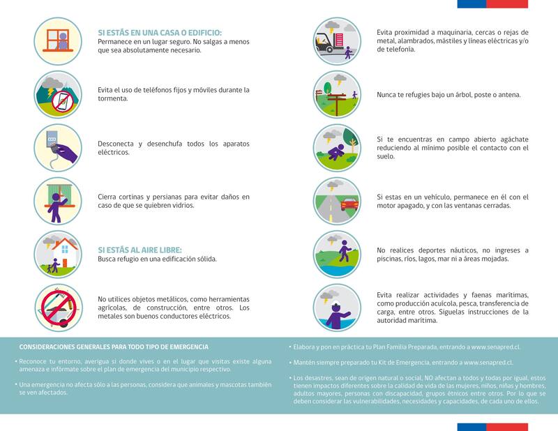Senapred entrega una serie de recomendaciones que pueden hacer las personas al encontrarse con una tormenta eléctrica, entre las que se encuentran: