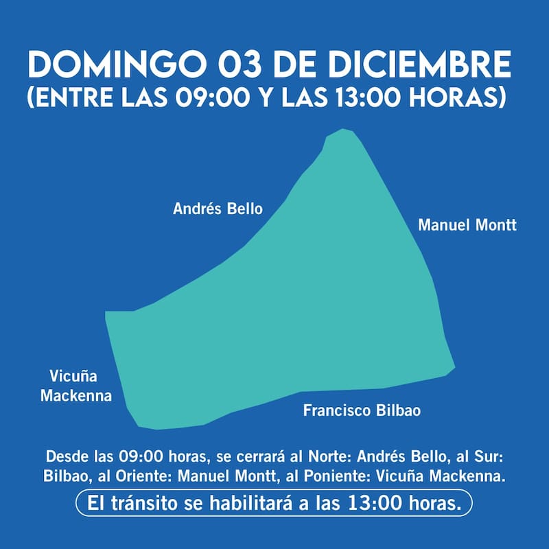 Además, la Municipalidad de Providencia señaló que los cortes de calles abordarán el cuadrante de Avenida Andrés Bello, Avenida Manuel Montt, Francisco Bilbao y Vicuña Mackenna. Esto ocurrirá entre las 09:00 horas y el tránsito se habilitará a las 13:00 horas.