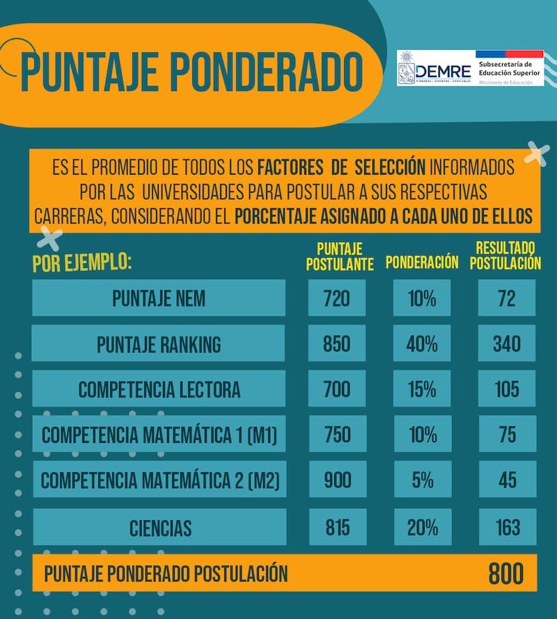Puntaje Ponderado: es el promedio de todos los factores de selección informados por las universidades para postular a sus respectivas carreras, considerando el porcentaje asignado a cada uno de ellos por subdivisiones.