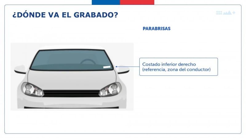 - El grabado de, al menos, 6 vidrios (laterales, luneta y parabrisas), además de los 2 espejos laterales. Ello, en caso que el vehículo tuviese más, donde sólo se exigirá el mínimo (ejemplo, furgones o buses). Ahora, si se trata de aquellos que cuenten con menos vidrios o espejos (por ejemplo, motos), la patente deberá estar grabada en todos sus espejos.