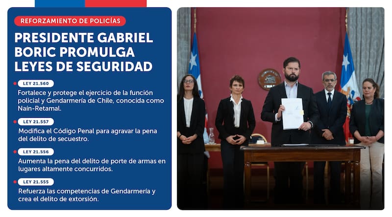 El Presidente de la República, Gabriel Boric, junto a la ministra del Interior Carolina Tohá y otros jefes de gabinete, promulgaron una serie de leyes de seguridad con el objetivo de enfrentar la delincuencia que se vive actualmente en el país.
