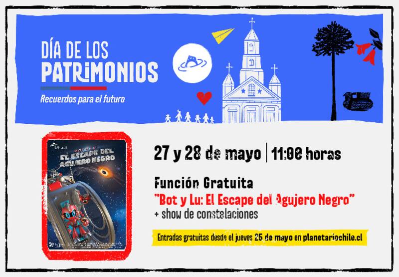 - Planetario: sábado 27 y domingo 28 de mayo de 2023 a las 11:00 horas. Contarán con función gratuita de “Bot y Lu: el escape del agujero negro”. Entradas gratuitas desde el jueves 25 en planetariochile.cl.