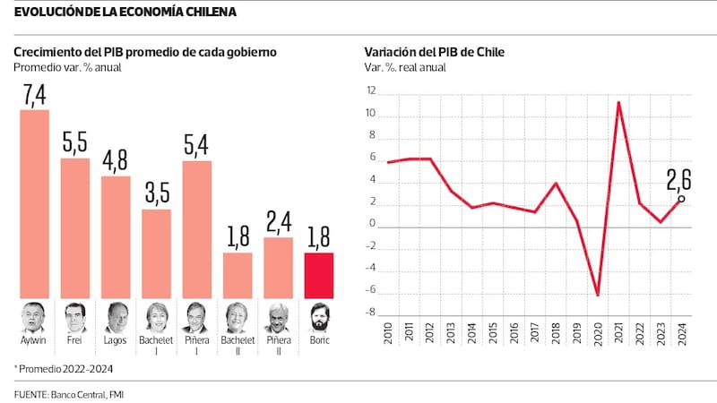 En este escenario, y dependiendo del comportamiento que tenga la economía este 2025, el gobierno de Boric podría librarse de transformarse en la administración que ostente la más baja tasa de crecimiento desde el retorno de la democracia.