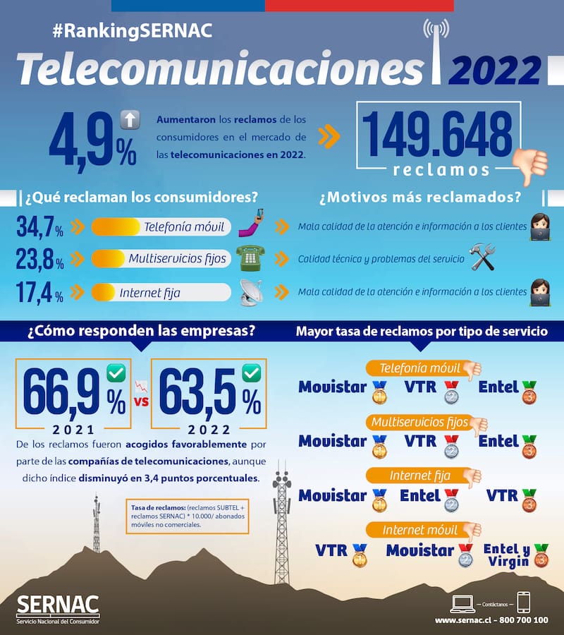 Según el reporte del Sernac, durante el año 2022, un 63,5% de los reclamos fueron acogidos favorablemente por parte de las compañías de telecomunicaciones, aunque dicho índice disminuyó en 3,4 puntos porcentuales si comparamos con el año 2021, cuando un 66,9% de los casos fueron acogidos por las empresas.