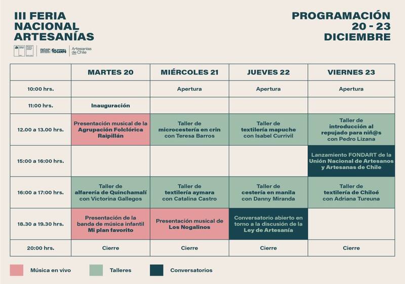 - 15:00: lanzamiento Fondart de la Unión Nacional de Artesanos y Artesanas de Chile.