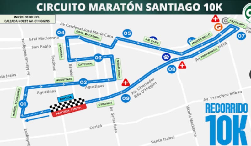 Además, las calles que están cerca del centro de la Maratón ya estarían cerradas: “Este sector fue intervenido para poder efectuar las instalaciones logísticas de todos los implementos para el evento, entre ellos las instalaciones de carpas, suministros, escenarios (...), todo ello se organizó en áreas donde está el eje Alameda, entre Teatinos, Morandé, Nathaniel Cox, Zenteno, Alonso Ovalle", señaló el teniente.