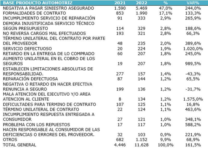 En segundo lugar, con 1.990 reclamos, se encuentran los temas relacionados con formalidades de contrato, tales como, términos unilaterales de los contratos de seguros automotrices. En comparación a 2021, hubo un aumento de 133%.
