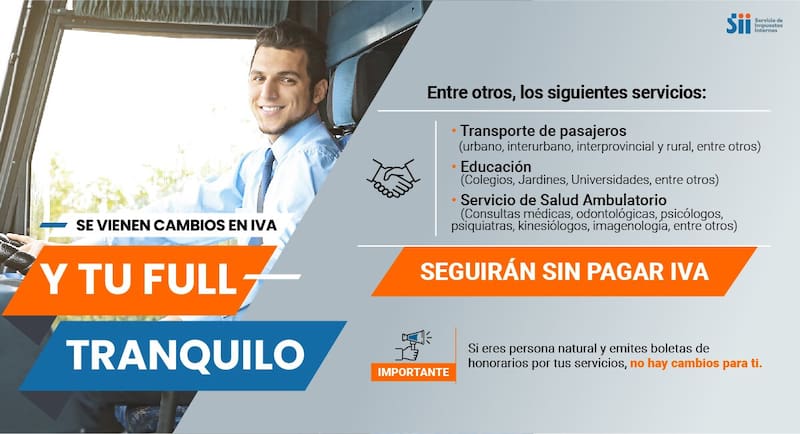 - Otros servicios que ya estaban exentos en la Ley de IVA, como entradas a espectáculos (con autorización del Ministerio de las Culturas, las Artes y el Patrimonio) y arrendamiento de inmuebles no amoblados, entre otros.