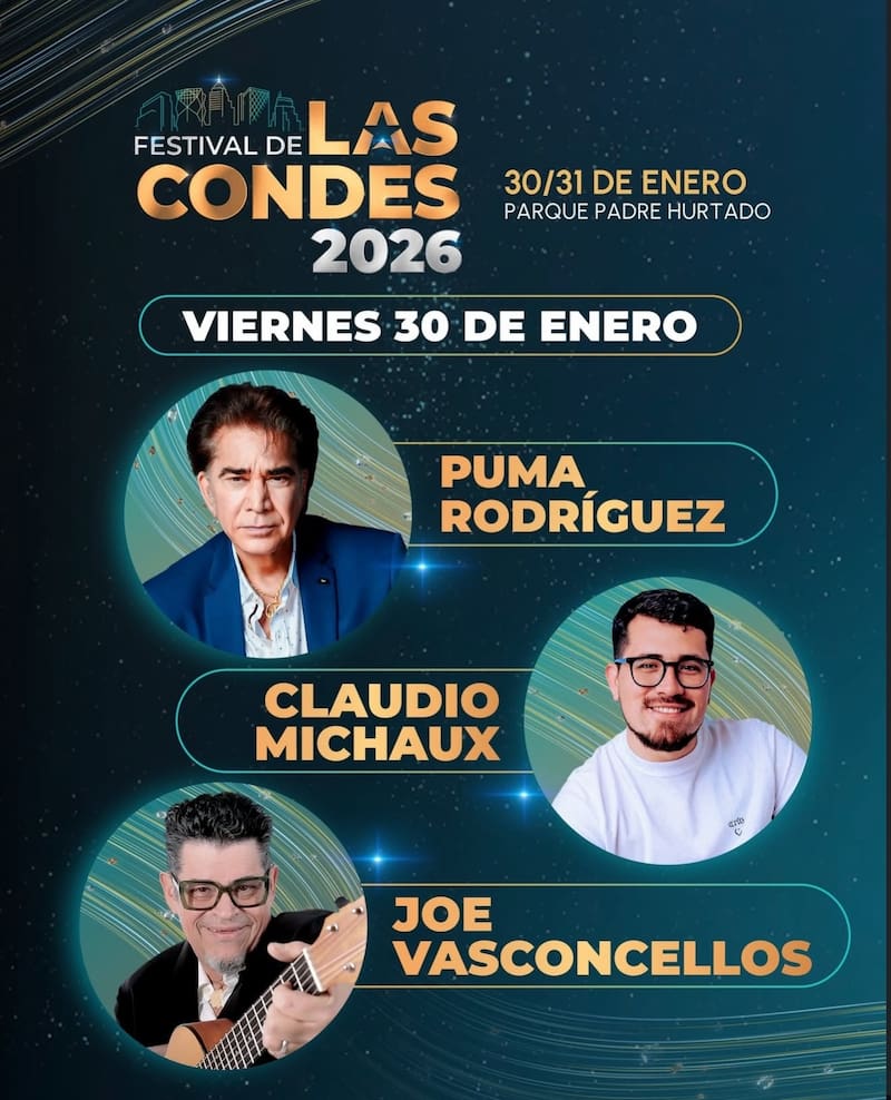 La programación del Festival de Las Condes 2026 indica que este viernes se presentarán el Puma Rodríguez, el comediante Claudio Michaux y la jornada cerrará con Joe Vasconcellos.
