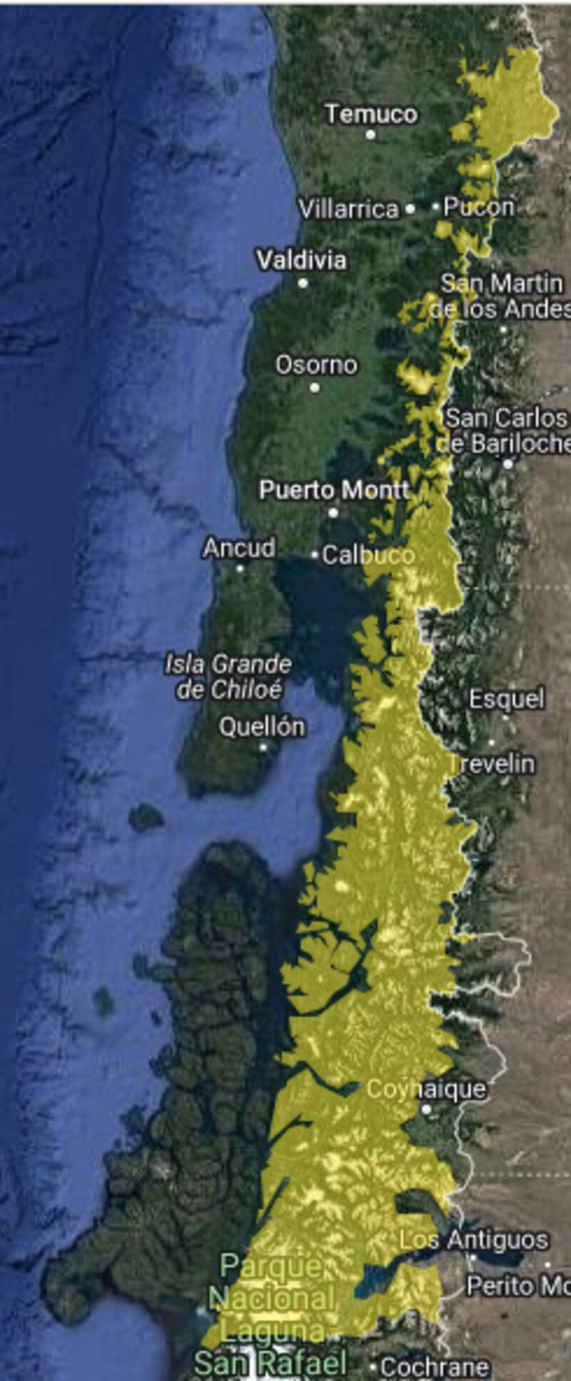 - Región de Aysén: cordillera austral norte.