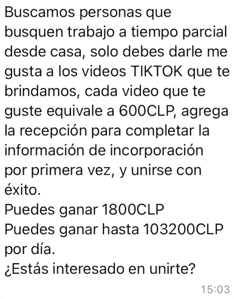 “Por ejemplo, la víctima paga $10 mil o $20 mil por esa membresía. Al mandar los pantallazos de los likes, por tener la membresía de $10 mil, le pagan $16 mil y por la de $20 mil, recibe $36 mil”, comentó Muñoz.