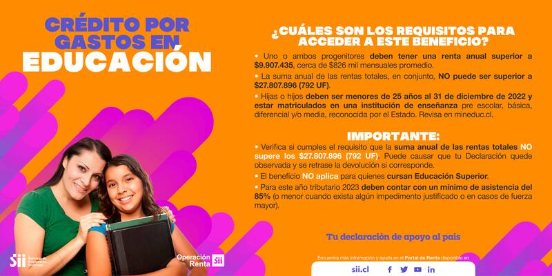 Este beneficio permite acceder a una rebaja de impuestos a pagar de hasta $154.488 (4,4 UF) en la Declaración de Renta, por cada hijo o hija que se encuentre estudiando, a excepción de alumnos de la educación superior.