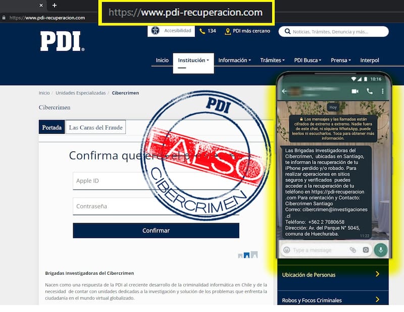 Se trata de una falsa dirección URL que al hacer clic, dirige a las personas a un link fraudulento, que se hace pasar por la PDI, para poder conseguir datos personales, a través de fraudes.