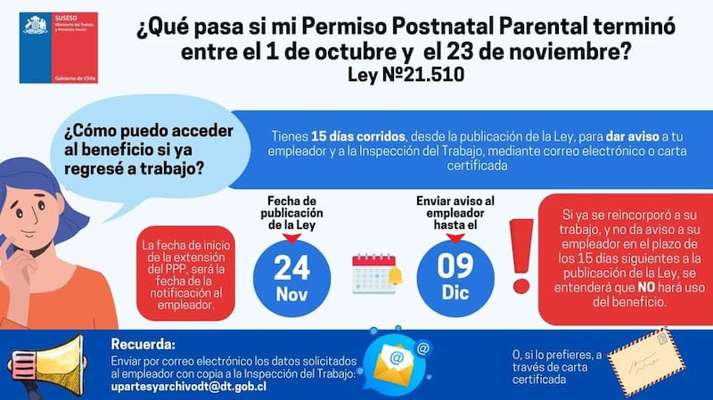 Si el periodo del Permiso Posnatal Parental que dura 84 días terminó entre el 1 de octubre y el 23 de noviembre del 2022 y ya volviste a trabajar, tienes un plazo de 15 días para dar aviso al empleador.